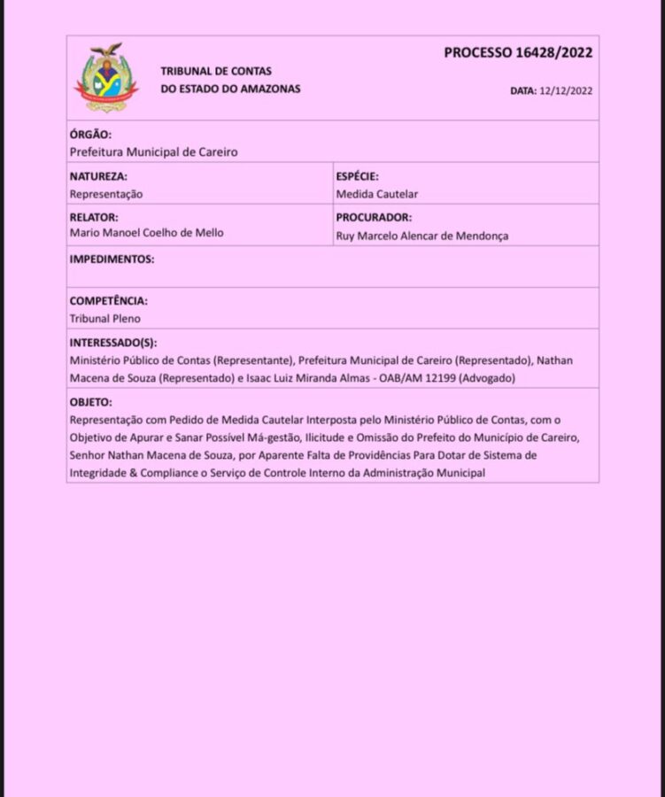 Na última sexta-feira (29), O Tribunal de Contas do Estado do Amazonas (TCE-AM), enviou um pedido de medida cautelar com o objetivo de apurar e sanar possível má-gestão, ilicitude e omissão do prefeito Nathan Macena no município do Careiro Castanho.