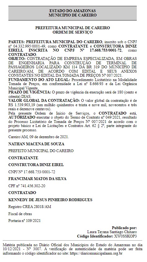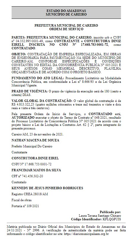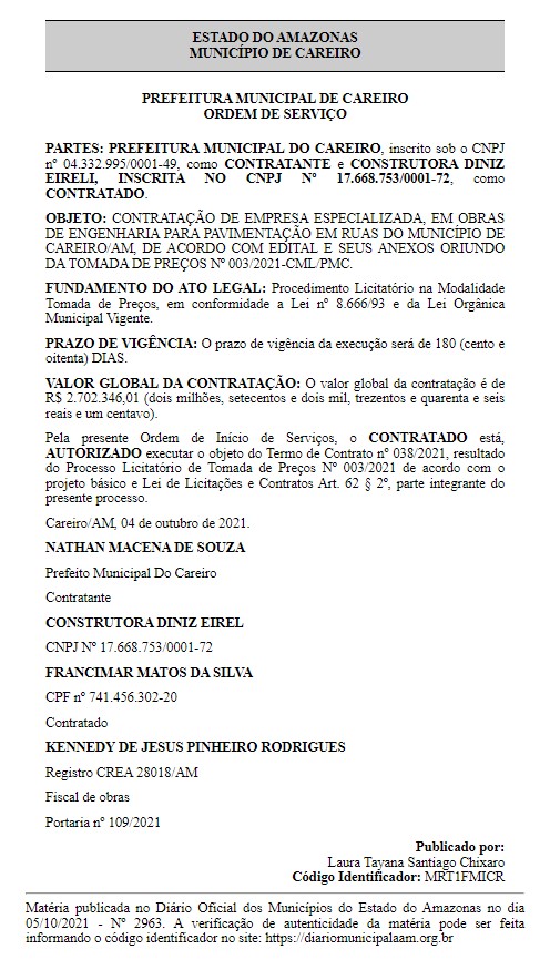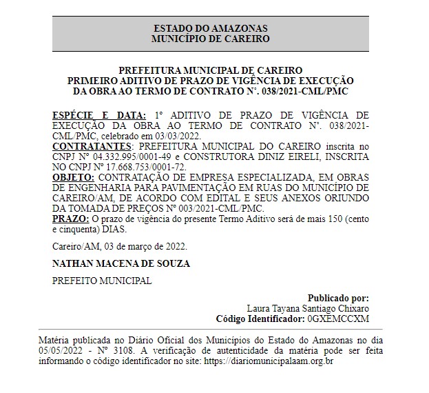Segundo o Diário Oficial dos Municípios do Amazonas (DOM), a CONSTRUTORA DINIZ EIRELI, recebeu junto à prefeitura do Careiro Castanho na gestão Natan Macena, o valor de R$ 2.702.346,01 (dois milhões, setecentos e dois mil, trezentos e quarenta e seis reais e um centavo), para a pavimentação de ruas naquele município, com o prazo de 180 (cento e oitenta) dias.