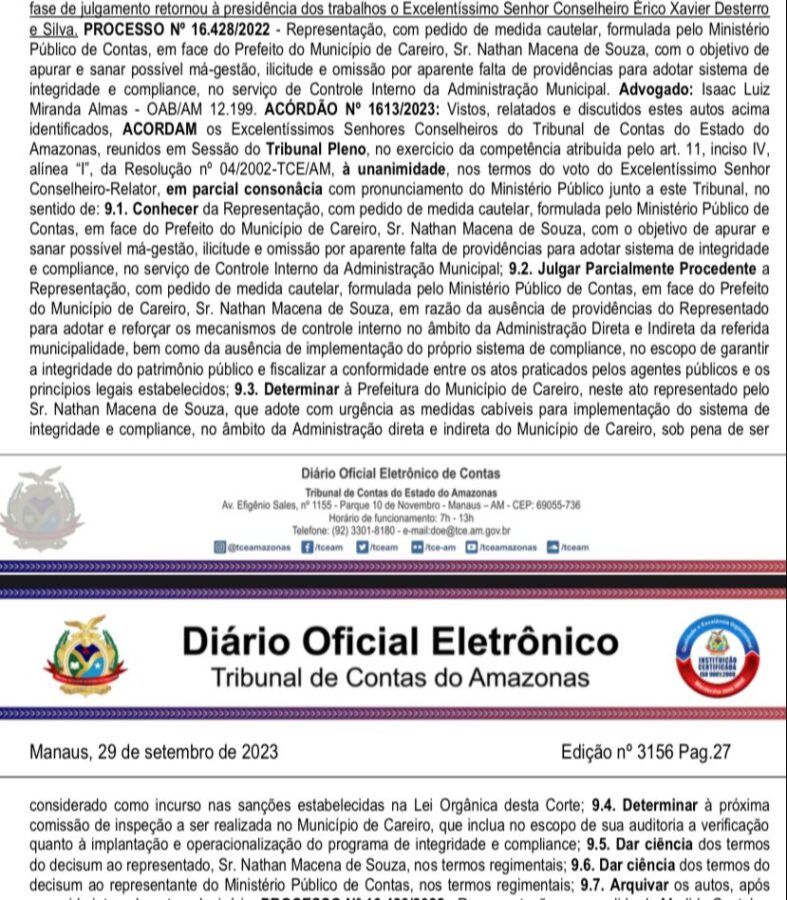 Na última sexta-feira (29), O Tribunal de Contas do Estado do Amazonas (TCE-AM), enviou um pedido de medida cautelar com o objetivo de apurar e sanar possível má-gestão, ilicitude e omissão do prefeito Nathan Macena no município do Careiro Castanho.