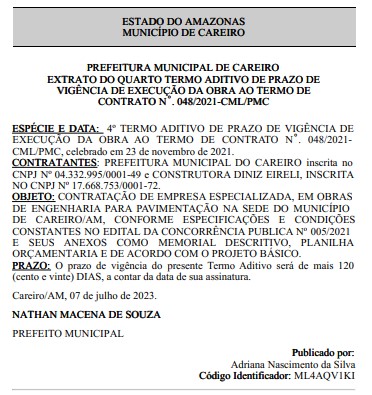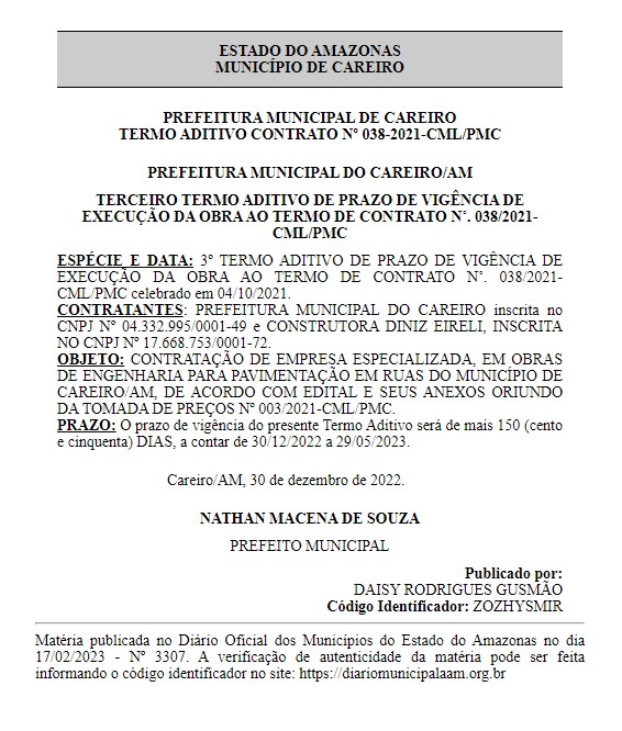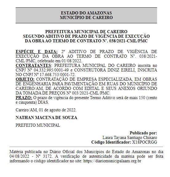 Segundo o Diário Oficial dos Municípios do Amazonas (DOM), a CONSTRUTORA DINIZ EIRELI, recebeu junto à prefeitura do Careiro Castanho na gestão Natan Macena, o valor de R$ 2.702.346,01 (dois milhões, setecentos e dois mil, trezentos e quarenta e seis reais e um centavo), para a pavimentação de ruas naquele município, com o prazo de 180 (cento e oitenta) dias.