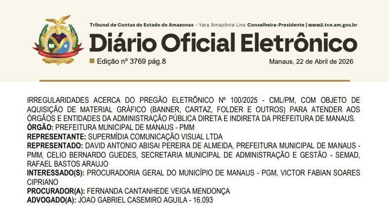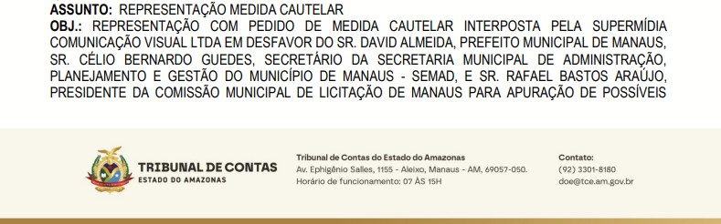 De acordo com o documento, o pleno do TCE-AM recebeu denúncias de irregularidades no Pregão Eletrônico Nº 100/2025, entre a Prefeitura de Manaus e a empresa SUPERMÍDIA COMUNICAÇÃO VISUAL LTDA, para a aquisição de material gráficos como banner, cartaz, folder e outros.