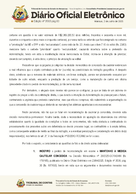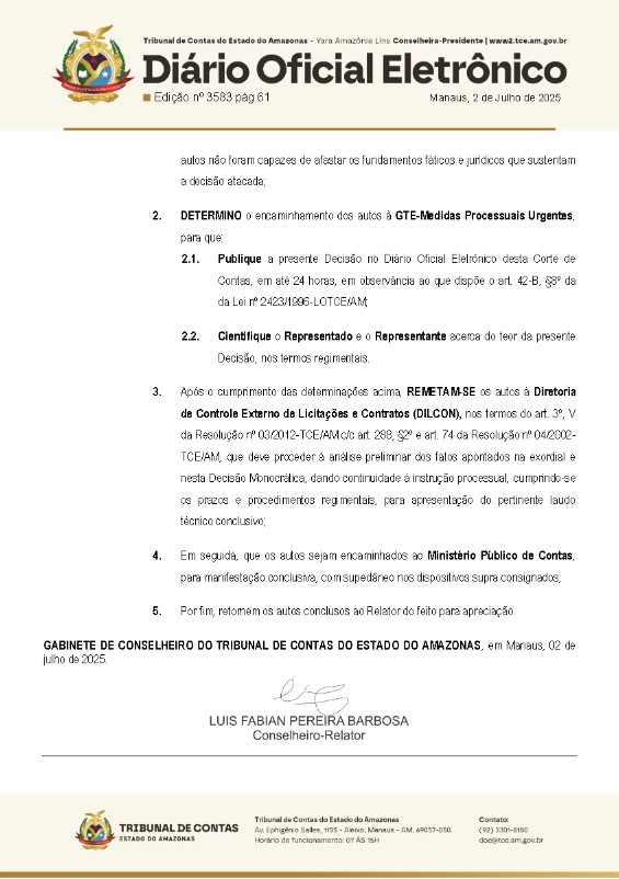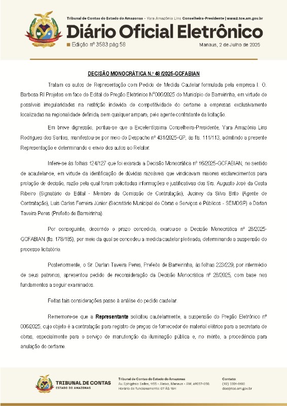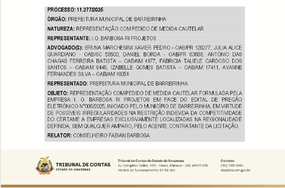 De acordo com a decisão do conselheiro Fabian Barbosa, o TCE-AM mantém suspensa o processo licitatório nº 11.277/2025, para a contratação de uma empresa para o fornecimento de material elétrico para a secretaria de obras de Barreirinha.