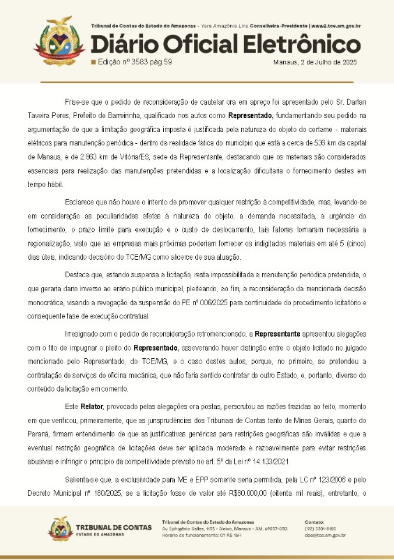 O Tribunal de Contas do Estado do Amazonas (TCE-AM), manteve suspensa uma licitação considerada irregular, indeferindo o pedido e reconsideração da Prefeitura de Barreirinha, no interior do Amazonas.