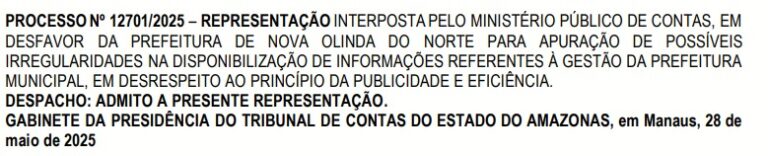 O MPC apontou que houve ‘omissão injustificada e reiterada’ por parte da prefeita de Nova Olinda do Norte e solicitou que o Tribunal de Contas do Estado do Amazonas aplicasse multa contra a gestora, caso não ocorra a atualização do Portal da Transparência.