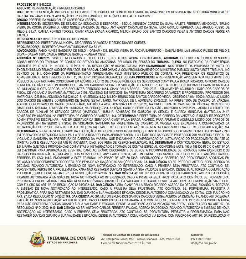 O Tribunal de Contas do Estado do Amazonas (TCE-AM) acatou uma representação, interposta pelo Ministério Público de Contas (MPC), contra o prefeito Pedro Guedes (PSD) e a Prefeitura do Careiro da Várzea, por irregularidades em acúmulos de funções por servidores municipais.