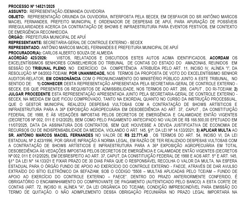 De acordo com a representação apresentada pela Secretaria-Geral de Controle Externo (Secex), Marquinhos da Macil contratou shows artísticos e infraestrutura para a 36ª Exposição Agropecuária de Apuí (Expoap), mesmo durante a um período vedade por um Decreto Emergêncial e de Calamidade feito pelo próprio gestor.