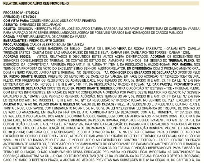 O Tribunal de Contas do Estado (TCE-AM) multou o prefeito Pedro Guedes (PSD), por pagamentos de salários abaixo do piso legal para os agentes comunitários de saúde do município de Careiro da Várzea.