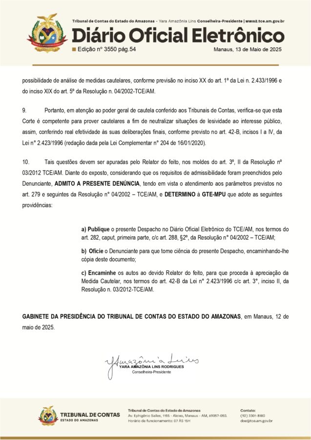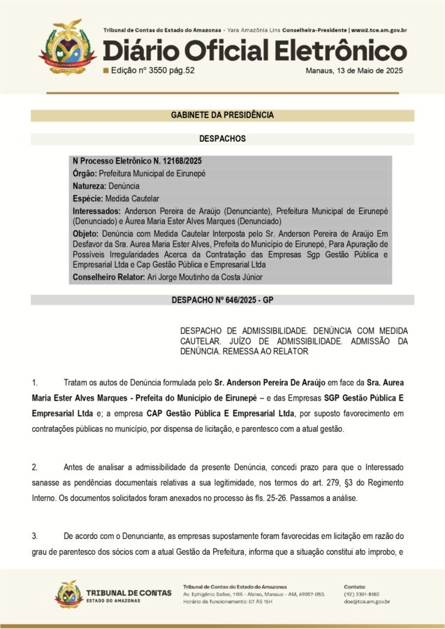 A prefeita de Eirunepé Professora Áurea Maria Ester Alves Marques (MDB), foi denunciada no Tribunal de Contas do Estado do Amazonas (TCE-AM), por favorecimento em contratações públicas sem licitação.