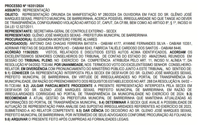 A Secretaria-Geral de Controle Externo (Secex) do Tribunal de Contas do Estado do Amazonas (TCE-AM), entrou com um pedido de representação com medida cautelar, contra a Prefeitura de Barreirinha e o ex-prefeito Glênio Seixas (UB), por irregularidades no Portal da Transparência.