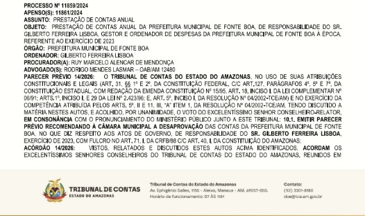O ex-prefeito Gilberto Ferreira Lisboa, mais conhecido como “Biquinho”, teve suas contas do exercício de 2023 reprovadas pelo Tribunal de Contas do Estado do Amazonas (TCE-AM).