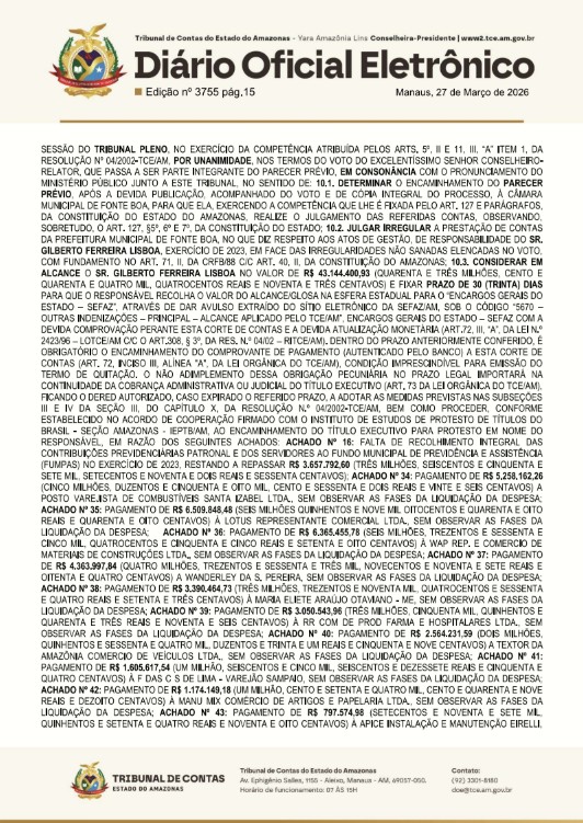 Além de recomendarem à Câmara Municipal de Fonte Boa pela desaprovação das contas de governo de biquinho, o ex-gestor foi multado em R$ 35 mil reais e deverá devolver aos cofres públicos o montante de R$ 43.144.400,93 (quarente e três milhões, cento e quarenta e quatro mil, quatrocentos reais e noventa e três centavos).