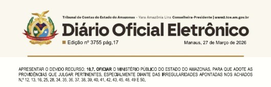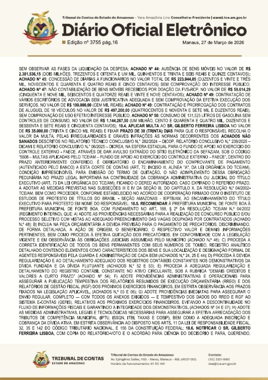 De acordo com o relatório apresentado ao TCE-AM, diversas falhas graves foram identificadas na execução orçamentária e financeira do município entre os principais achados está a falta de repasse integral de contribuições previdenciárias ao Fundo Municipal de Previdência e Assistência (Fumpas), com um débito de R$ 3.657.792,60.