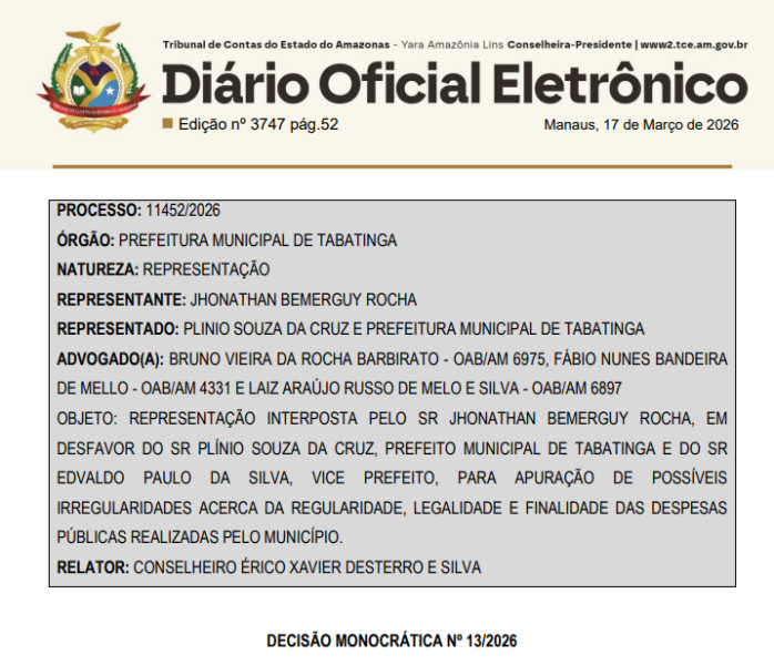 Uma licitação com indícios de irregularidades e graves falhas de transparência da Prefeitura de Tabatinga, na gestão do prefeito Plínio Cruz (Republicanos), foi suspensa pelo Tribunal de Contas do Estado do Amazonas (TCE-AM).
