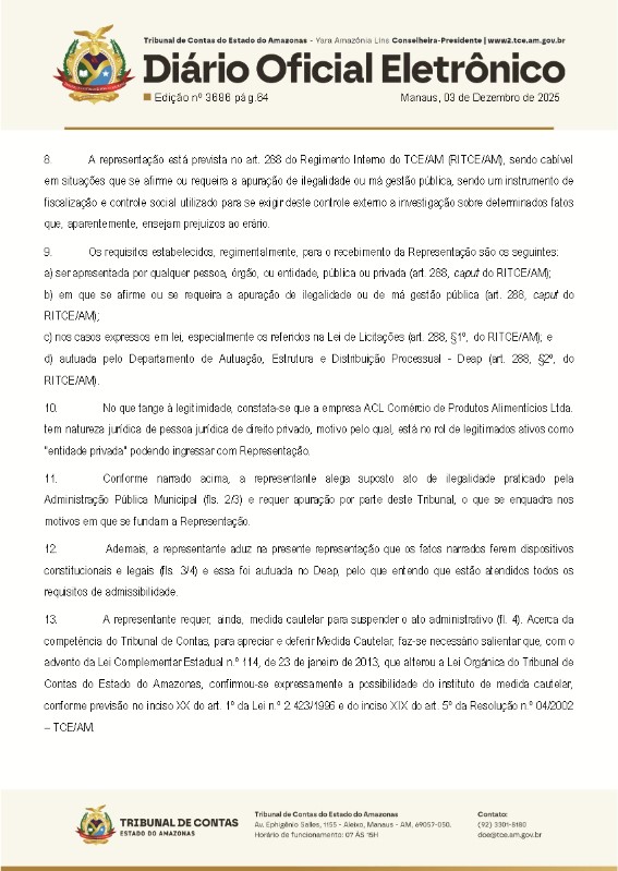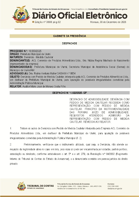 O Tribunal de Contas do Estado do Amazonas (TCE-AM), acatou o pedido de representação com medida cautelar contra a Prefeitura de Uarini e o prefeito Marcos Martins (UB), para suspender uma licitação de compra de gêneros alimentícios por irregularidades na administração municipal.
