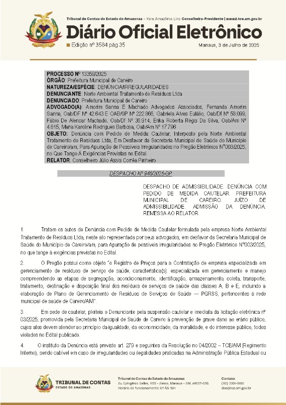 De acordo com a denúncia feita ao órgão ministerial, a empresa NORTE AMBIENTAL TRATAMENTO DE RESÍDUOS LTDA, teria apresentado durante o Pregão Eletrônico nº 003/2025 para o serviço de gerenciamento, manejo, segregação, acondicionamento, identificação, armazenamento e coleta de resíduos de serviços de saúde no município.