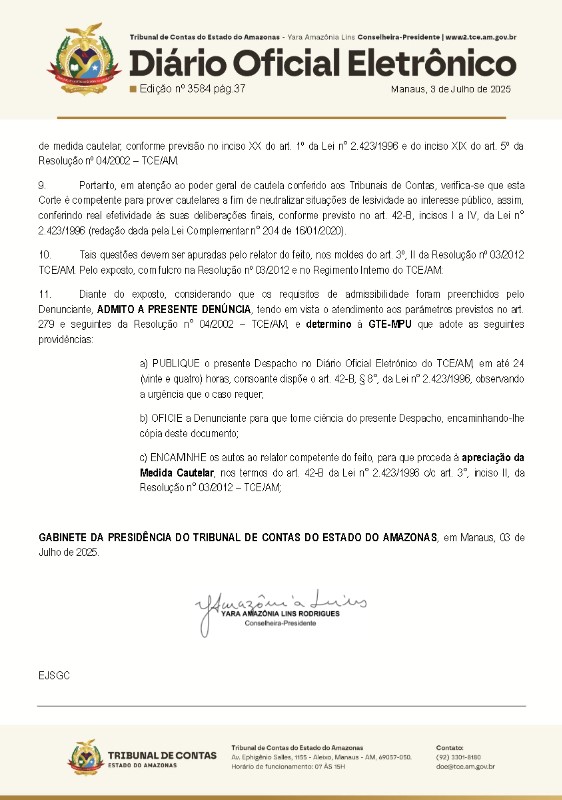 Irregularidades em uma contratação, levou o Tribunal de Contas do Estado do Amazonas (TCE-AM), a conceder uma representação com pedido de medida cautelar suspendendo o contrato promovido pela Prefeitura Municipal do Careiro Castanho, na gestão da prefeita Mara Alves (Republicanos).