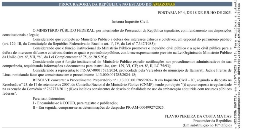 De acordo com a publicação feita no Diário Oficial do órgão, o MPF instalou um inquérito civil público e uma ação civil pública para investigar danos ao erário e ao patrimônio público em Itamarati.