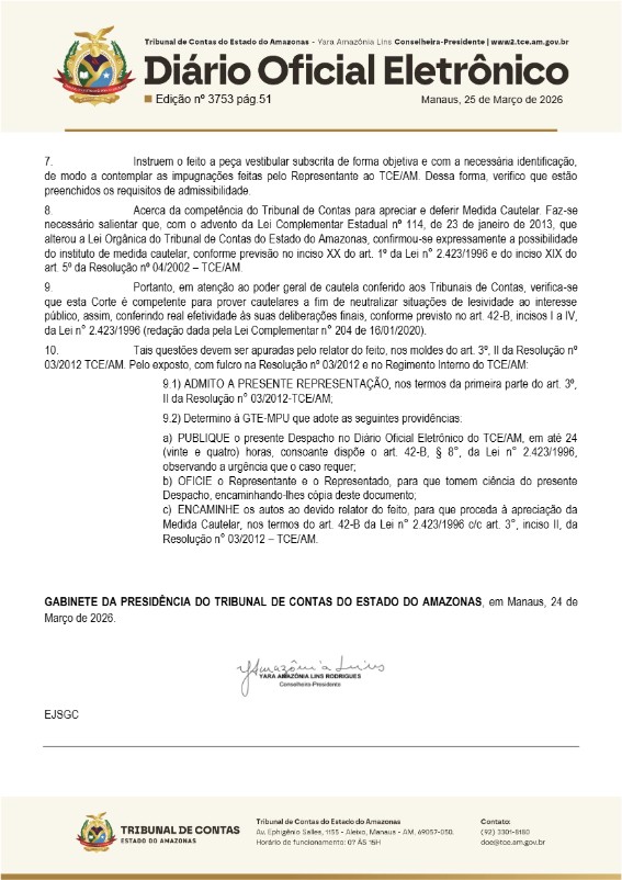 De acordo com a representação com pedido de medida cautelar, foram encontradas irregularidades nos procedimentos licitatório nº 002/2026, 003/2026, 004/2026, 005/2026 e 006/2026 apresentaram irregularidades como falhas na condução da licitação.