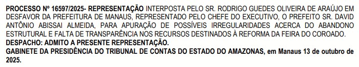 O Tribunal de Contas do Estado do Amazonas (TCE-AM), admitiu uma representação com pedido de medida cautelar contra o prefeito David Almeida (Avante), por conta do abandono da Feira do Coroado, localizado na Avenida Cosme Ferreira, na zona Leste de Manaus.