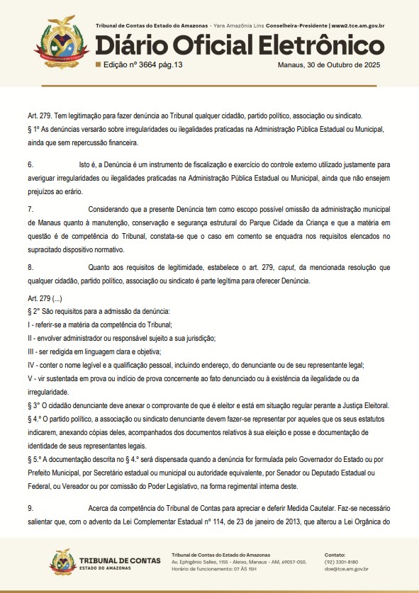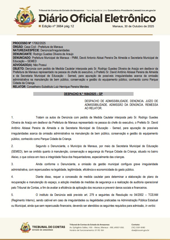 O Tribunal de Contas do Estado do Amazonas (TCE-AM), acatou uma representação com um pedido de medida cautelar contra a Prefeitura de Manaus, o prefeito David Almeida (Avante) e a Secretaria Municipal de Educação (Semed), por conta do sucateamento do Parque da Criança.