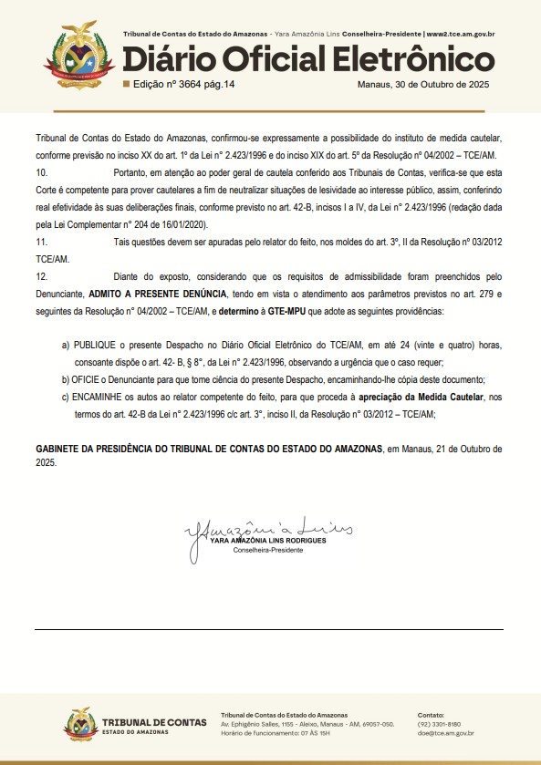 De acordo com o documento, o “pedido de Medida Cautelar interposta em desfavor da Prefeitura de Manaus representado na pessoa do chefe do executivo, o Prefeito Sr. David