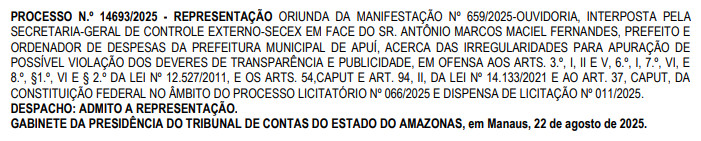 O documento homologado no Diário Oficial do órgão nesta segunda-feira (25/08), aponta que Marquinhos da Macil pode ter violado os deveres de transparência e publicidade e “ofensa aos ARTS. 3.º, I, II e V, 6.º, I, 7.º, VI, e 8.º, §1.º, VI E § 2.º da Lei Nº 12.527/2011, e os ARTS. 54,CAPUT e ART. 94, II, DA LEI Nº 14.133/2021 e ao ART. 37, CAPUT da Constituição Federal, no âmbito do Processo Licitatório Nº 066/2025 e na dispensa de licitação Nº 011/2025”.