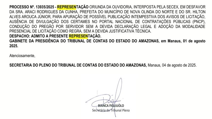 A Secretaria de Controle Externo (Secex) ingressou no Tribunal de Contas do Estado do Amazonas (TCE-AM), com uma representação com pedida de medida cautelar, contra prefeita Araci Cunha (MDB) por irregularidades em licitações em Nova Olinda do Norte, no interior do Amazonas.