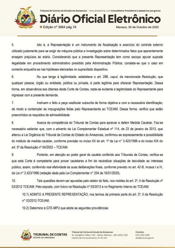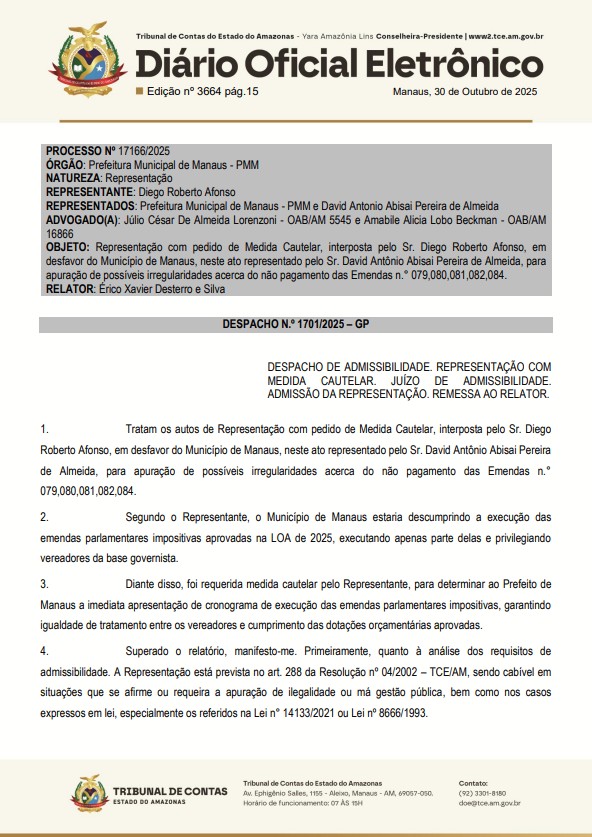 “Diante disso, foi requerida medida cautelar pelo Representante, para determinar ao Prefeito de Manaus a imediata apresentação de cronograma de execução das emendas parlamentares impositivas, garantindo igualdade de tratamento entre os vereadores e cumprimento das dotações orçamentárias aprovadas”, diz um trecho do documento.
