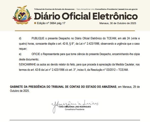 Com isso, o TCE concedeu a medida cautelar contra a Prefeitura de Manaus. A Corte determinou, ainda, a comunicação urgente da decisão ao prefeito e à parte representante, além da publicação no Diário Oficial do órgão. Caso a determinação não seja cumprida, o chefe do Executivo poderá ser penalizado com sanções administrativas.