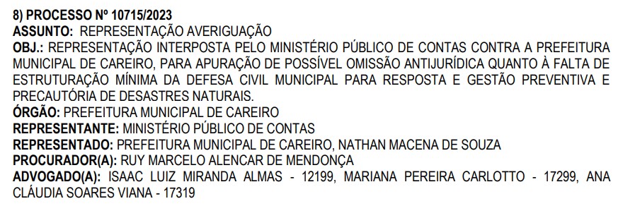 De acordo com a denúncia do Ministério Público de Contas, o prefeito Nathan Macena deliberadamente deixou a Defesa Civil do Município do Careiro, ficar sucateada e sem infraestrutura para uma resposta e gestão de possíveis desastres naturais que possam ocorrer no município.
