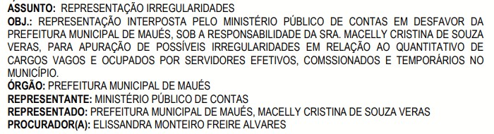 De acordo com informações do documento apresentado ao Tribunal de Contas do Estado do Amazonas (TCE-AM), a a representação é para investigar as possíveis irregularidades da prefeita Macelly Veras, que não informou o quantitativo de cargos vagos e ocupados por servidores efetivos, comissionados e temporários no município.