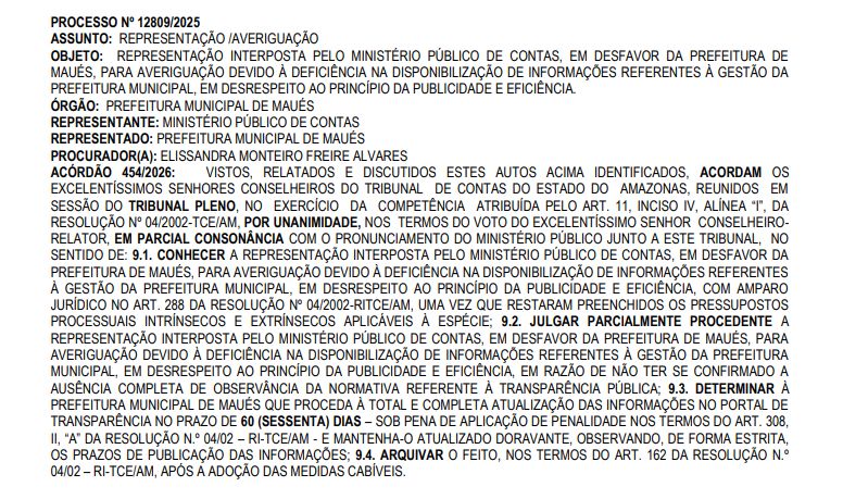 De acordo com a representação do MPC, apontou falhas na divulgação de dados da gestão Macelly Veras na Prefeitura de Maués, porque a situação contraria princípios como a publicidade, que garante o acesso da população às informações, e a eficiência na gestão pública.