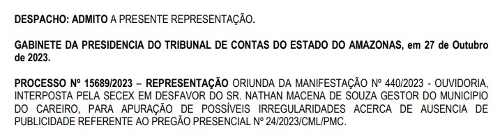 O Tribunal de Contas do Estado do Amazonas (TCE-AM), acolheu uma denúncia contra o prefeito do município do Careiro Castanho, Nathan Macena de Souza, por suspeitas de ilícitos em um pregão presencial de prestação de serviços no município.