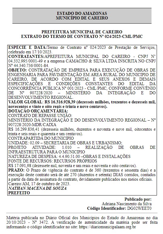 De acordo com a denúncia feita ao Tribunal de Contas do Amazonas, o pregão presencial para a contratação de uma empresa de engenharia identificada como CAMACHO & SILVA LTDA, para executar a pavimentação de áreas na zona rural do Castanho.