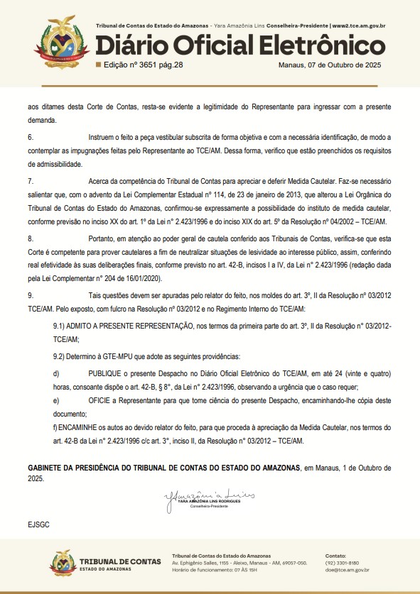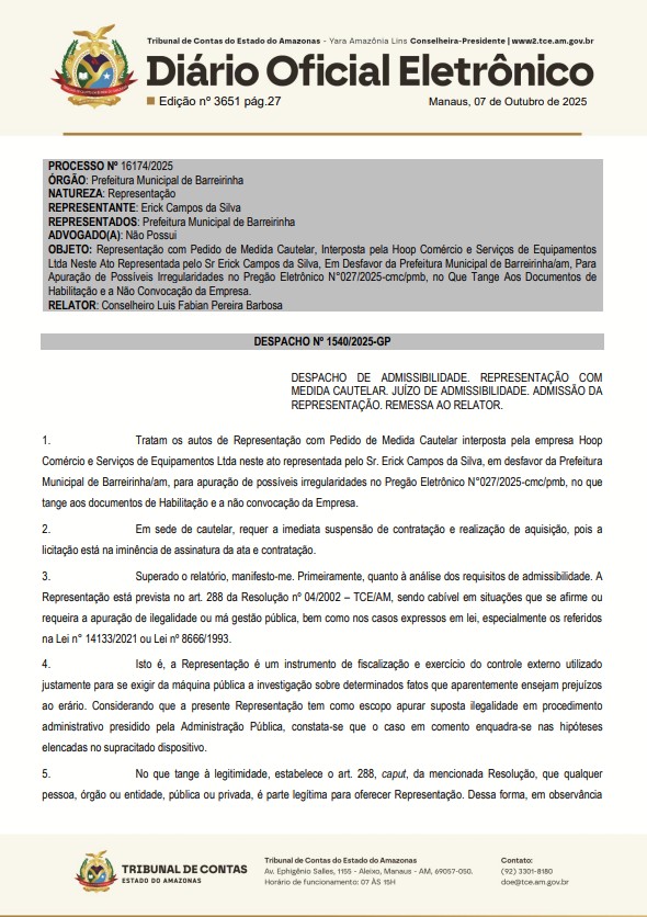 De acordo com o documento homologado em Diário Oficial, uma empresa solicita ao TCE-AM que investigue irregularidades a cerca do Pregão Eletrônico N°027/2025-cmc/pmb, que apresentou irregularidades.