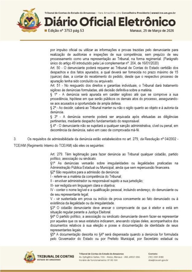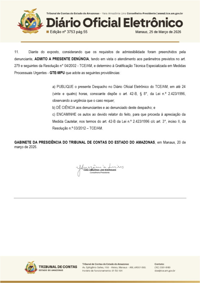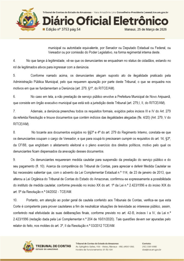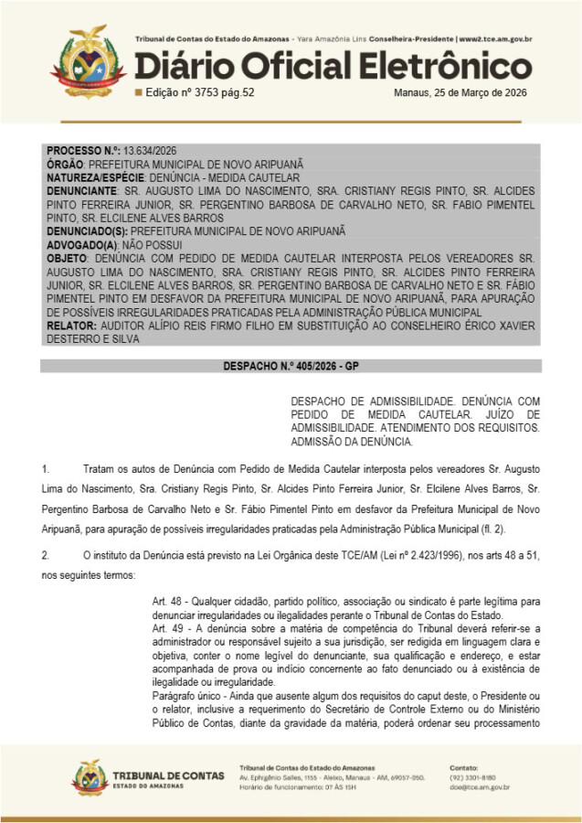De acordo com informações do Diário Oficial do TCE-AM, um grupo de vereadores da cidade, apresentaram uma denúncia contra o prefeito por suposta não prestação de serviços públicos e outras irregularidades na administração municipal.