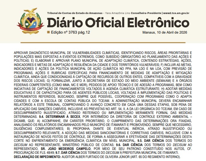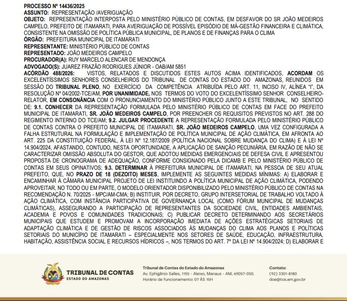 O Tribunal de Contas do Estado do Amazonas (TCE-AM) acatou uma representação interposta pelo Ministério Público de Contas (MPC), contra a Prefeitura de Itamarati e seu gestor João Campelo (MDB), por má-gestão financeira e climática.