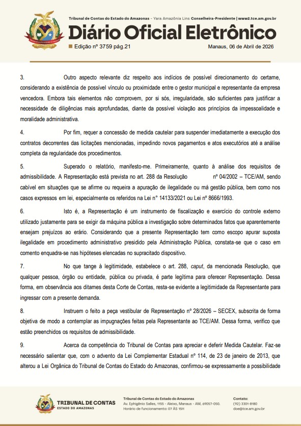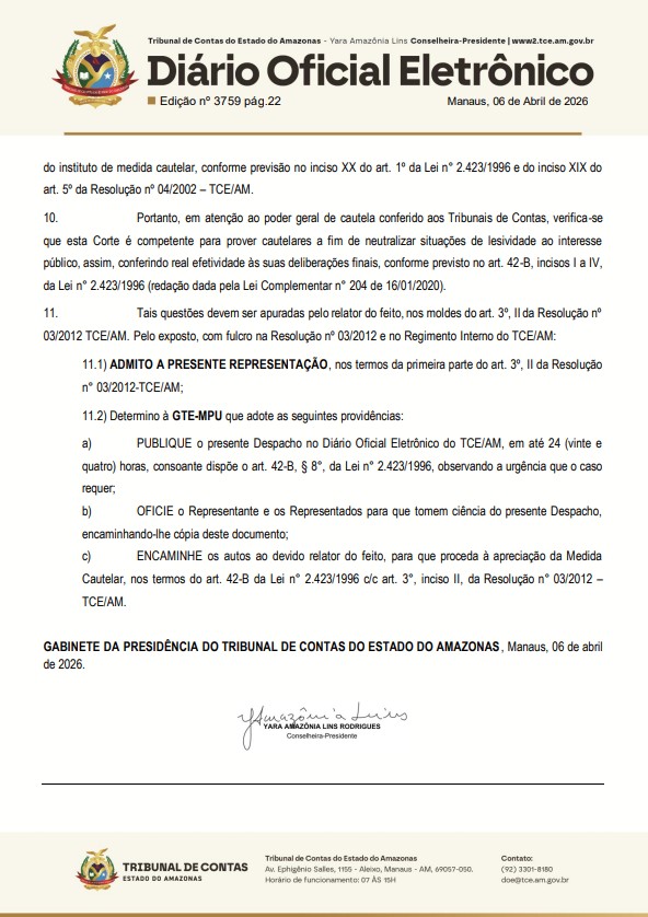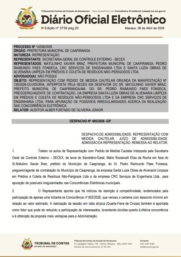 O Tribunal de Contas do Estado do Amazonas (TCE-AM), acatou um pedido de medida cautelar contra o prefeito Matulinho Xavier Braz (UB), por suspeitas de irregularidades em Concorrências Eletrônicas no município de Caapiranga.