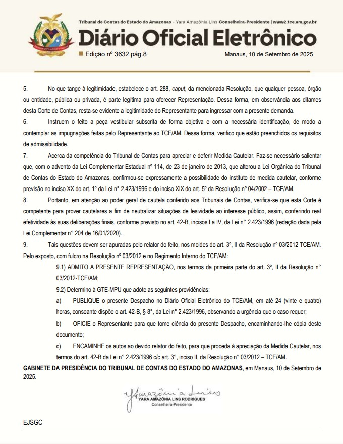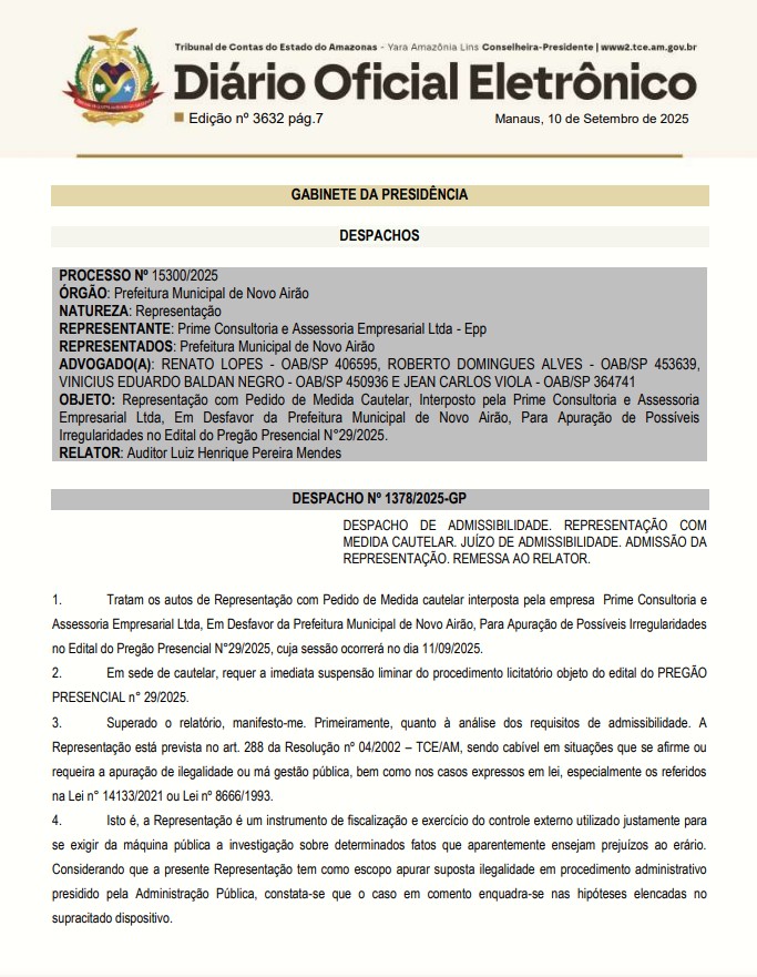 Conselheiros do Tribunal de Contas do Estado do Amazonas (TCE-AM), aceitaram um pedido de representação com medida cautelar, contra a Prefeitura de Novo Airão e seu gestor, o prefeito Otávio Farias (UB), por suspeitas de irregularidades em licitação.