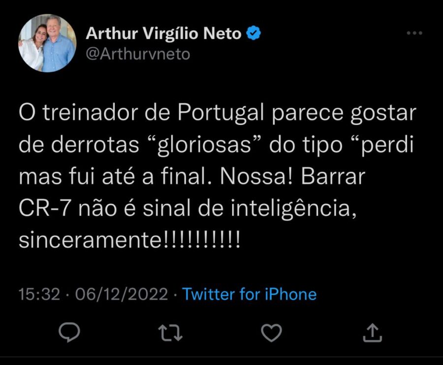 Mas na tarde de hoje um novo um técnico revelação deu uma opinião em sua rede social onde fez pouco caso da escolha do técnico de Portugal ao deixar o CR7 no banco e colocar Gonçalo Ramos de apenas 21 anos e não acreditar no jovem jogador. Segundo Arthur Virgílio Neto seria uma burrice deixar Cristiano Ronaldo , cinco vezes melhor do Mundo fora na reserva e Portugal iria perder o jogo por causa da escolha do técnico Fernando Santos sendo que Portugal fez uma grande partida mostrando que além do jovem Gonçalo que fez hat-trick conta com outras promessas como Rafael Leão que fez o último gol da partida e foi um golaço. Mostrando que o Arthur Virgílio Neto é um excelente técnico de Futebol.