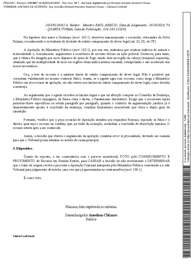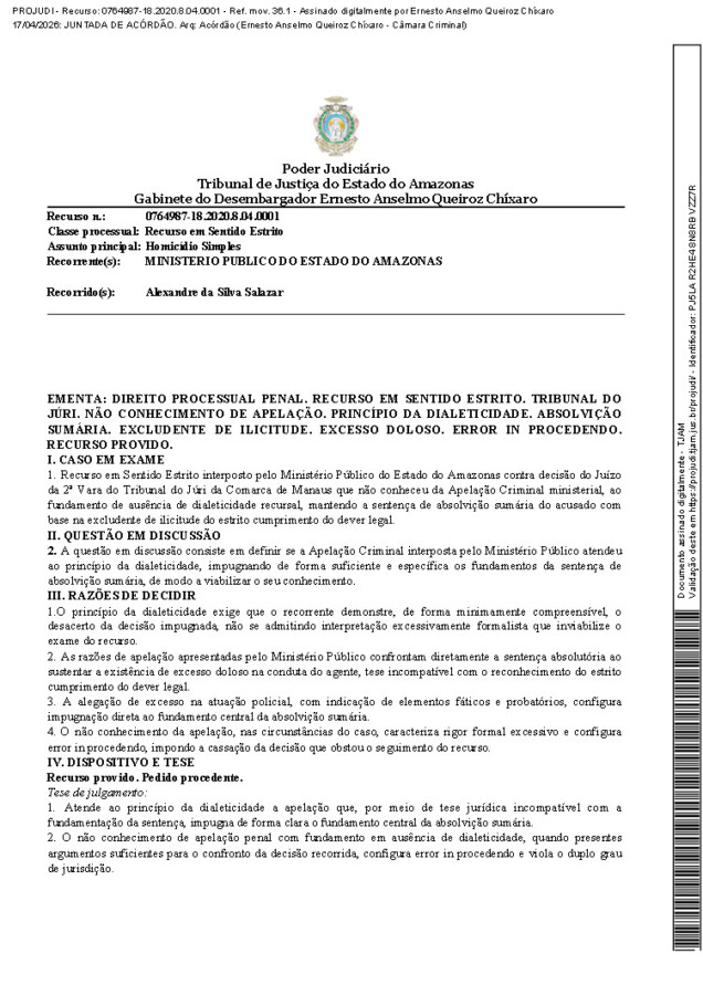 A decisão foi proferida pela Câmara Criminal da Corte, que entendeu haver erro processual na decisão de primeira instância que havia barrado o andamento do recurso do Ministério Público. À época, o Juízo da 2ª Vara do Tribunal do Júri de Manaus deixou de receber a apelação sob o argumento de ausência de dialeticidade, ou seja, de que o recurso não teria enfrentado diretamente os fundamentos da sentença.