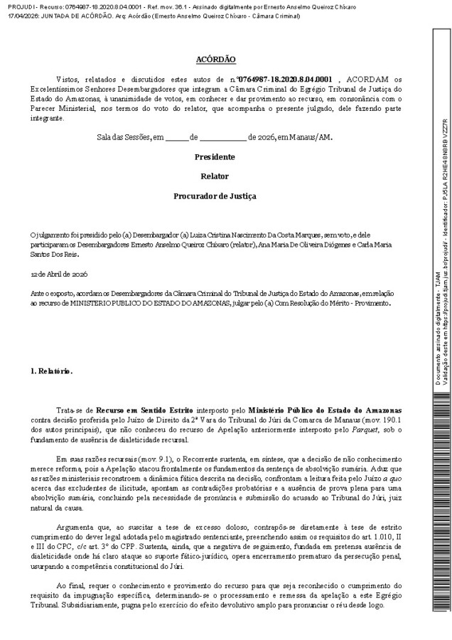 Com a decisão do TJAM, a apelação criminal deverá ser processada e julgada pelo próprio Tribunal, que irá analisar o mérito do recurso e decidir se mantém a absolvição ou se o caso seguirá para julgamento pelo Tribunal do Júri.