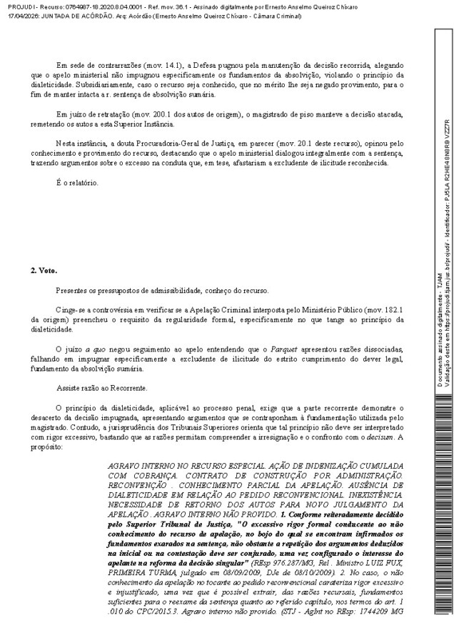 Relator do processo, o destacou que o Ministério Público sustentou, de forma clara, a existência de possível excesso doloso na conduta atribuída ao vereador, tese que se contrapõe diretamente ao entendimento de que ele teria agido no estrito cumprimento do dever legal, fundamento que levou à absolvição em primeira instância.