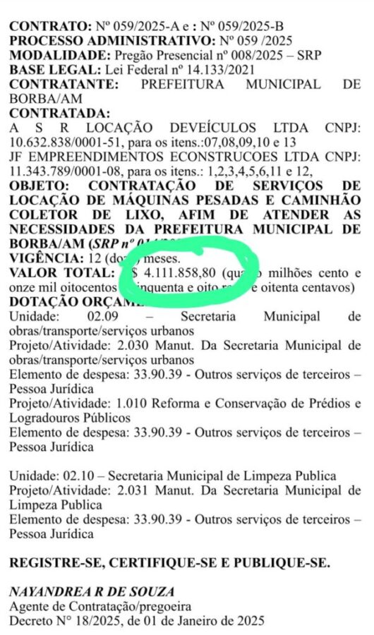 De acordo com informações do Diário Oficial dos Municípios (DOM), a Prefeitura de Borba contratou a empresa A. S. R. LOCAÇÃO DE VEÍCULOS LTDA e a empresa J. F. EMPREENDIMENTOS ECONSTRUÇÕES LTDA pelo valor de R$ 4.111.858,80 (quatro milhões, cento e onze mil, oitocentos e cinquenta e oito reais e oitenta centavos), pelo aluguel do maquinário.