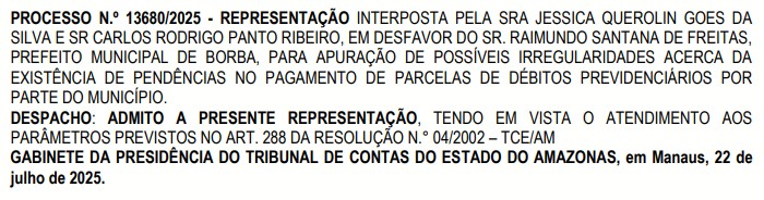 A segunda representação com pedido de medida cautelar contra o prefeito de Borba, para apurar possíveis irregularidades e uma pendência no pagamento de parcelas do débito previdenciário por parte do município.