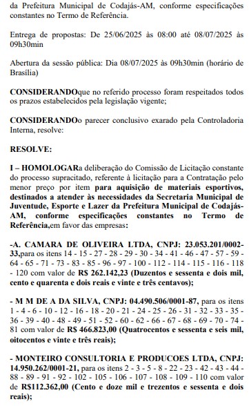 A empresa A. CAMARA DE OLIVEIRA LTDA vai receber R$ 262.142,23 (Duzentos e sessenta e dois mil, cento e quarenta e dois reais e vinte e três centavos). Já a empresa M. M. DE A. DA SILVA vai ganhar R$ 466.823,00 (Quatrocentos e sessenta e seis mil, oitocentos e vinte e três reais) da Prefeitura de Codajás.