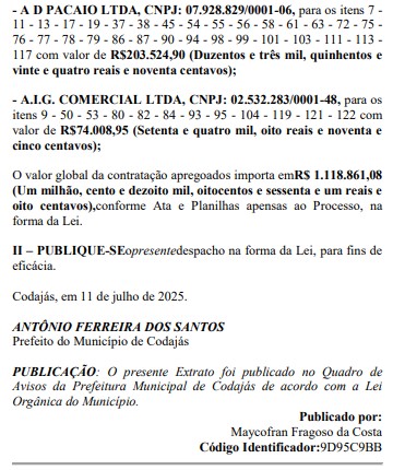 A quinta empresa contratada foi a MONTEIRO CONSULTORIA E PRODUÇÕES LTDA, que vai receber da Prefeitura de Codajás o valor total de R$ 112.362,00 (Cento e doze mil e trezentos e sessenta e dois reais), por alguns lotes de produtos.