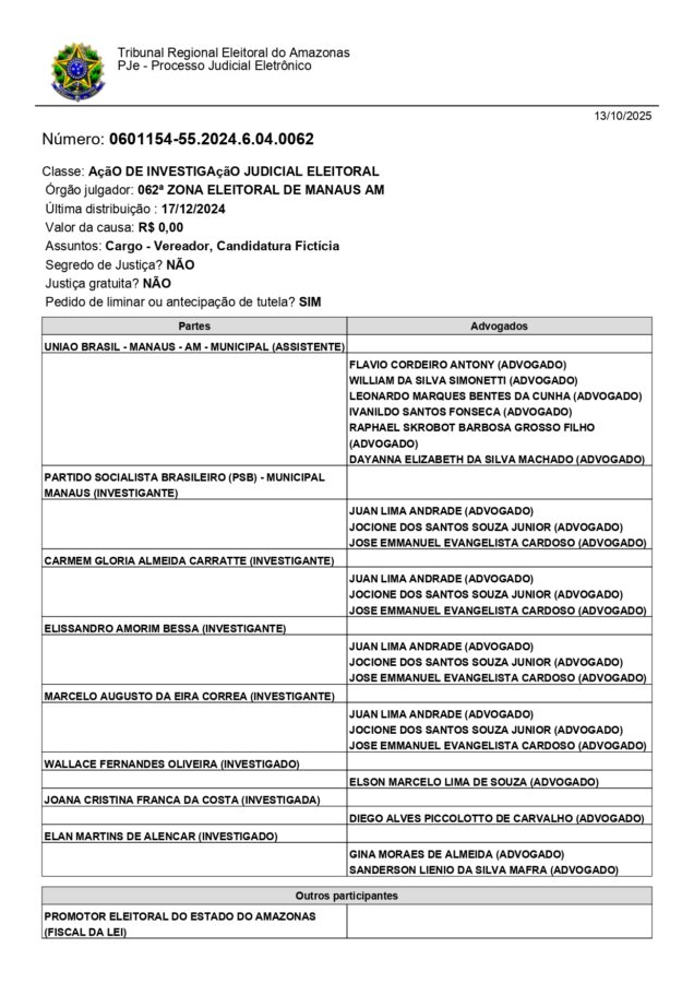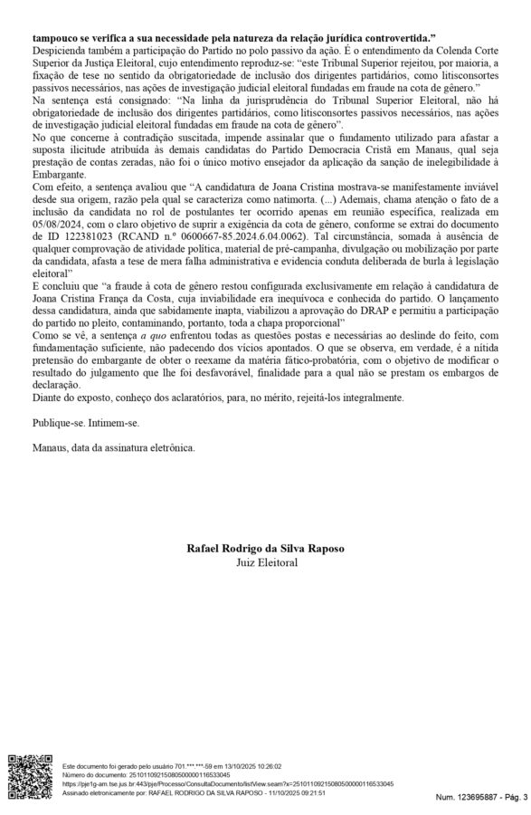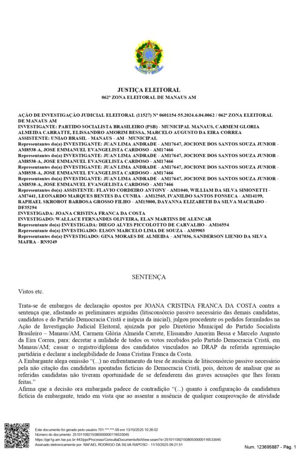 Na Ação de Investigação Judicial Eleitoral (AIJE), proposta pelo partido PSB, juntamente com os candidatos Elissandro Bessa, Marcelo Serafim e a própria Glória Carrate o magistrado destacou que a candidata pelo DC Joana Cristina França da Costa, foi feita em 2024 para atingir o percentual mínimo de 30% de candidaturas femininas exigido por lei.