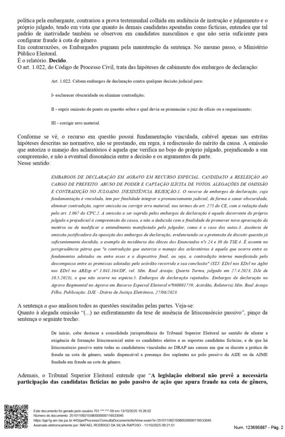 “Tal circunstância, somada à ausência de qualquer comprovação de atividade política, divulgação ou mobilização por parte da candidata, evidencia conduta deliberada de burla à legislação eleitoral”, escreveu juiz Rafael Rodrigo da Silva Raposo.
