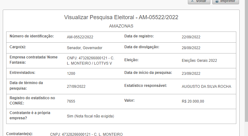 A empresa LOTTS V voltou a registrar uma pesquisa eleitoral no sistema do Tribunal Superior Eleitoral (TSE) contendo o mesmo disco sem o nome e a foto de Omar Aziz. O registro veio após a primeira pesquisa ser suspensa pelo Tribunal Regional Eleitoral do Amazonas (TRE-AM).